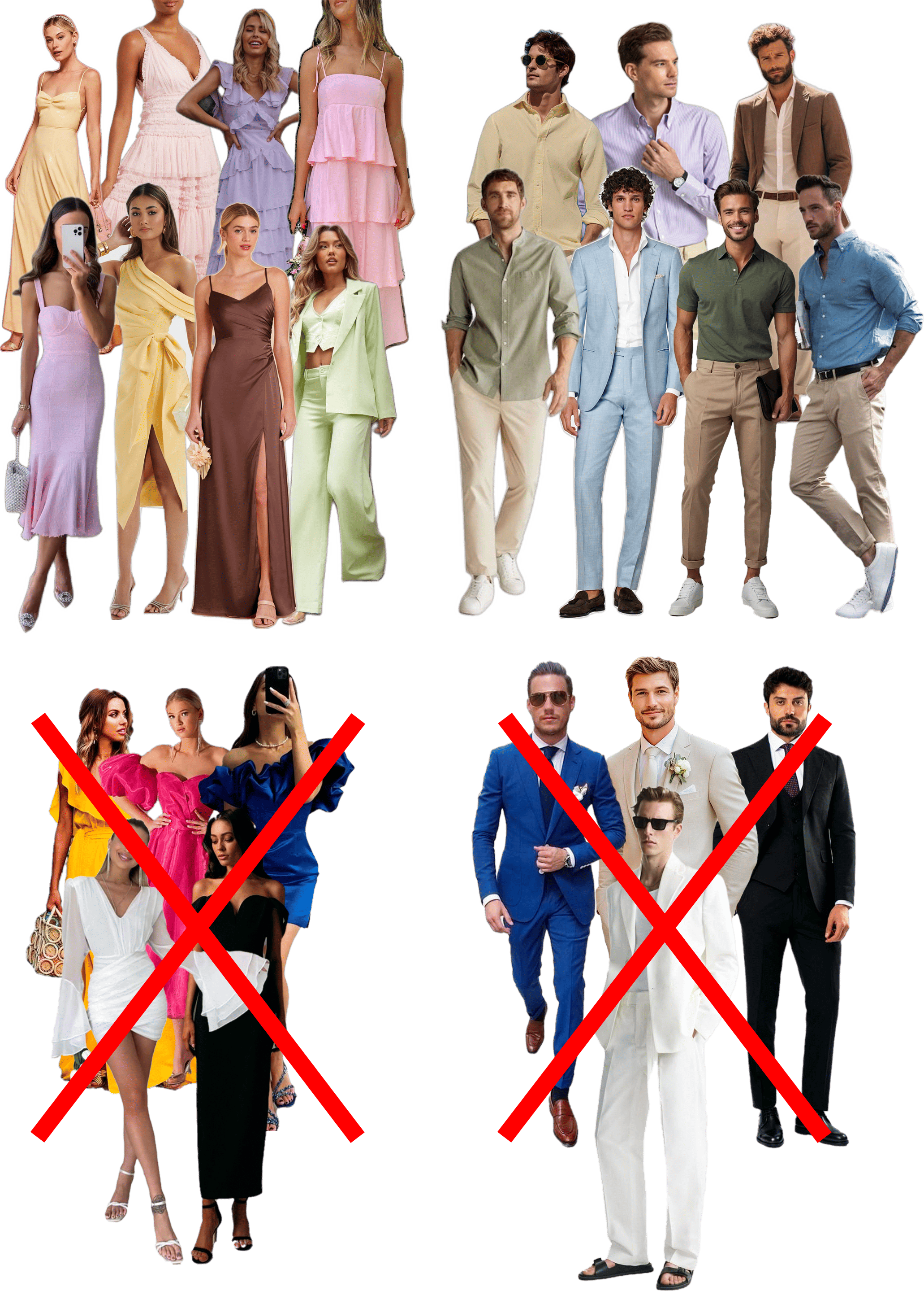 Просим не надевать полностью белые/чёрные и очень яркие костюмы, чтобы наши фотографии получились гармоничными :)